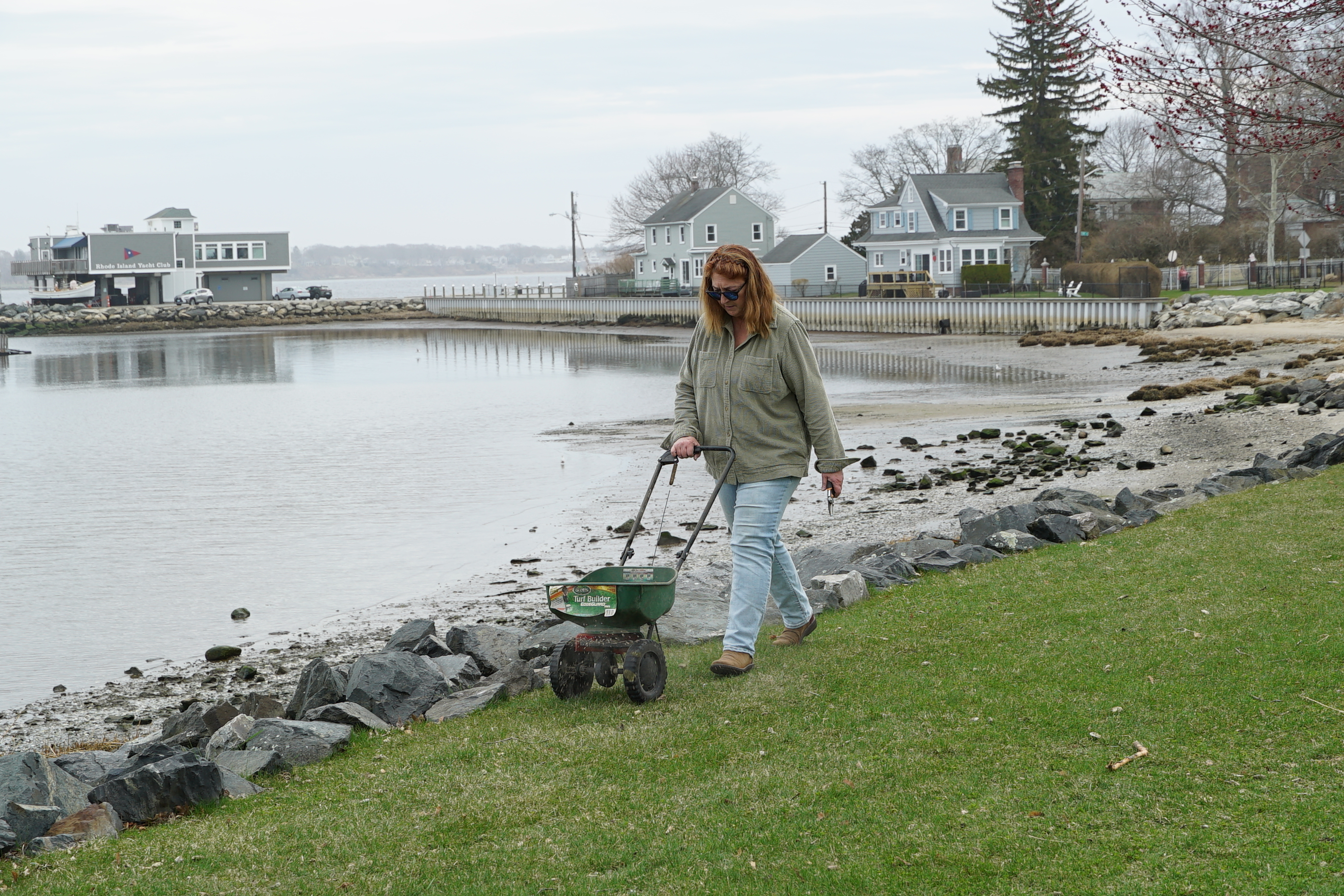 After a particularly rough winter, Stillhouse Cove Park and its surroundings need treatment. In particular, the mounds of snow deposited in the Park left behind salt, grit, and damaged turf. In the photo below, Donna Fieldman, EWPA board member, is seen spreading gypsum to mitigate the effects of road salt and ice melt and encourage the grass root system.
